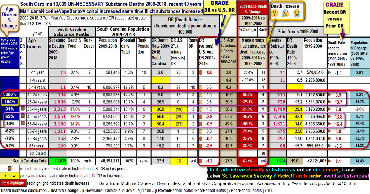 SOUTH CAROLINA 63.1% substance death increase recent 10 Years 2009-2018 (Substance Deaths = mind-altering Substance deaths, see Substance Death ICD List below)
